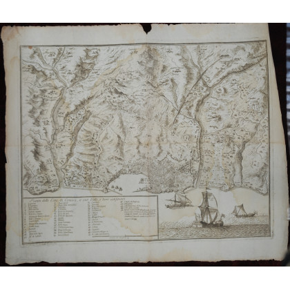 (Genova) Bianchi (Editore?) "Pianta della Città di Genova, e sue Valli", e terre confinanti". Milano, Bianchi, sec XVIII incisione in rame. Pianta della città presa dal mare con vascelli in acqua. In basso a sinistra entro riquadro legenda con cinquanta richiami (mm 385x485, foglio 445x535). Segni di pieghe, fenditure nelle parti incise, gore d'acqua, una lacuna nel margine superiore bianco