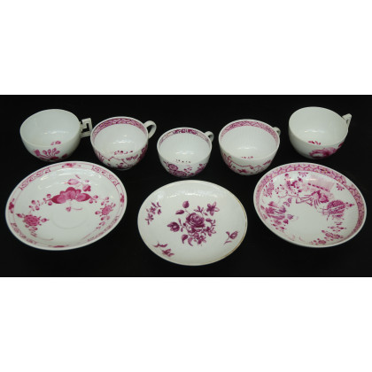 Manifattura di Meissen. Lotto composto da cinque tazzine e tre piattini in porcellana decorati a fiori nei toni del rosa. Epoche diverse (difetti)