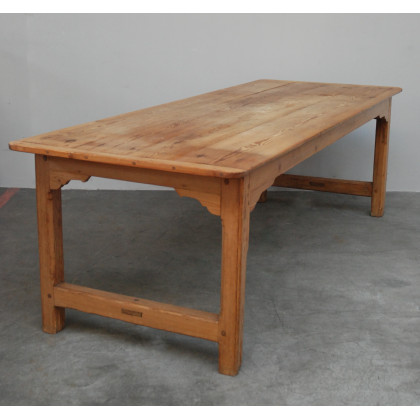 Tavolo rustico in legno di larice, piano con angoli stondati, fascia a mensola, gambe delle testate raccordate da traverse (cm 250x76x90)(difetti)