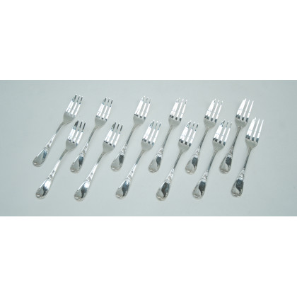Gruppo di dodici forchettine da dolce in argento cesellato a volute. Titolo 800 (gr 280)
