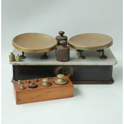 Lotto composto da una bilancia in legno e marmo e alcuni pesi. Inizio del secolo XX (difetti)