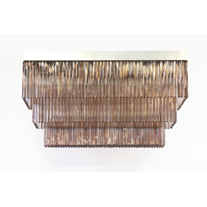 Manifattura di Murano - Grande lampadario a tre ordini di pendagli trilobati e quadrilobati in vetro sommerso molato con anima ambrata. Struttura a griglia in metallo verniciato ottone, cornice in alluminio ottonato. Anni 60 del sec XX. Mnufacture of Murano - Large chandelier with sommerso glass pendants, circa 1960s