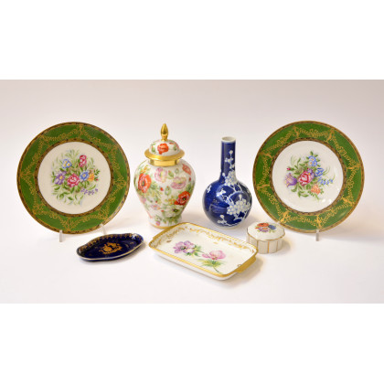 Manifatture diverse, lotto composto da una potiche, un vasetto, una bomboniera, due portacenere e due piattini (difetti)