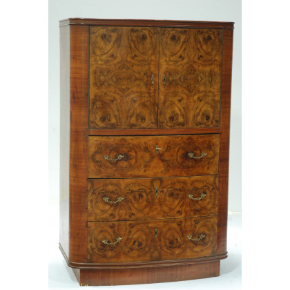 Credenza in radica di forma mossa a due ante e tre cassetti, 1940 circa (cm 146x94x48)(difetti)