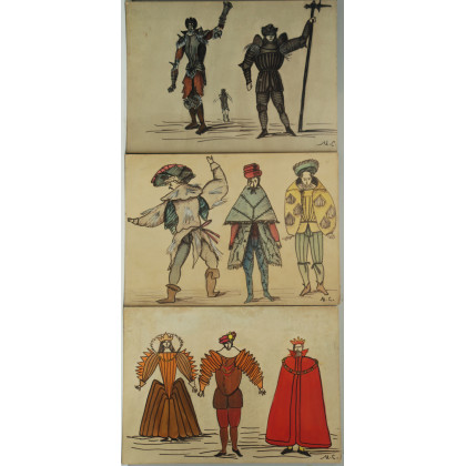 Gruppo di sedici bozzetti per costumi a tecnica mista su cartone, alcuni siglati (difetti)