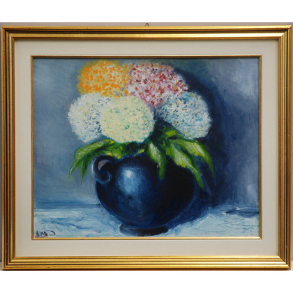 Anonimo del XX secolo "Vaso di Ortensie", olio su tela (cm 40x49)