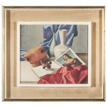 "Natura morta con violino, vasi e Gioconda" olio su masonite (cm 33x39) Firmato in basso a sinistra, in cornice