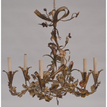 Lampadario a sei fiamme in metallo dorato a forma di foglie e fiori a tutto tondo (difetti)