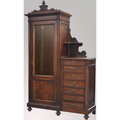 Armadio con anta in vetro ed annesso mobile cassettiera terminante con pinnacoli torniti (cm 140x235x54)(difetti)