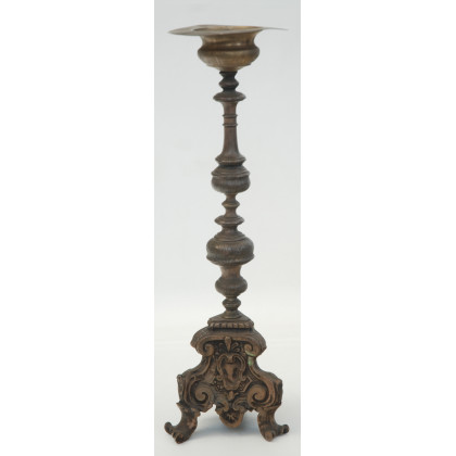 Candeliere in metallo sbalzato fusto a tornito inciso a volute e fiori base tripode, sec. XVIII (cm 49)(difetti)