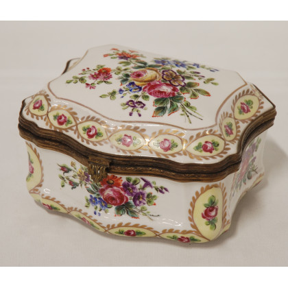 Manifattura di Sevres scatola in porcellana, decorata in policromia a fiori, ghiera in metallo dorato (cm 18x12x17)