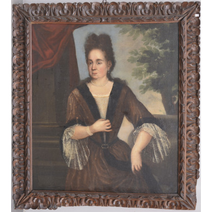 Scuola secolo XVIII. "Ritratto di dama" olio su tela (cm 90 x100) in cornice in noce intagliata a volute (difetti, restauri e mancanze)