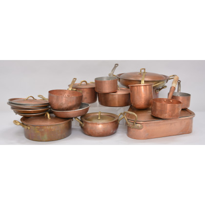 Lotto di tre cartoni contenenti numerose padelle in rame con manici in ottone