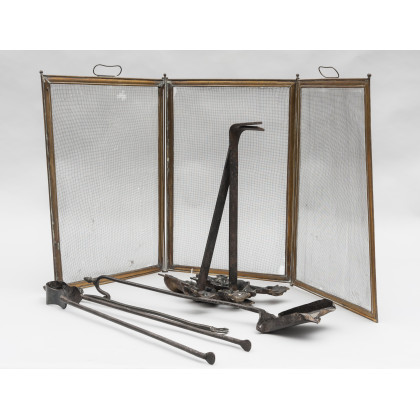Coppia di alari, parascintille e attrezzi da camino in metallo dorato