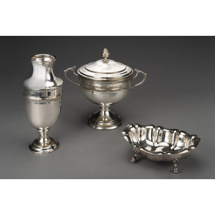 Lotto composto da zuccheriera con piedini ferini un vasetto con bordo cordonato e una zuccheriera biansata con coperchio e presa a forma di pigna in metallo argentato