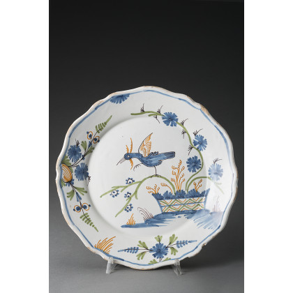 Piatto in maiolica bordo mistilineo cavetto centrato da volatile tra foglie e fiori,marcato al retro.Sec.XVIII (d cm 22, 5) (difetti e mancanze)
