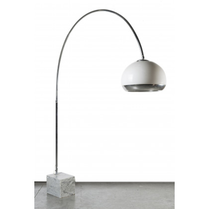 Lampada ad arco in acciaio e metallo cromato con base in marmo e paralume in perspex. Italia anni '60 (h tot cm 210) (difetti)