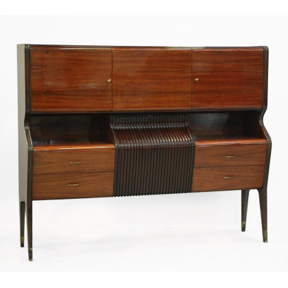 Contro-buffet in legno e impiallacciatura di palissandro indiano, guarnizioni in ottone, piano in vetro, interni in acero con scomparto bar. Atelier di Varedo, anni 40 del sec XX (cm 178x145x44) (lievi difetti)