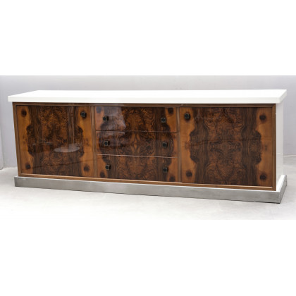 Credenza con piano laccato bianco a tre cassetti e due ante impiallacciate in radica. Italia, anni 70 (cm 220x77x50) (difetti)
