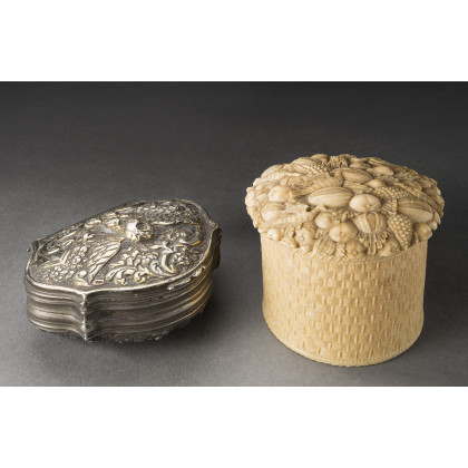 Lotto composto da una scatola in avorio intagliato e una in argento sbalzato a fiori e aquila (gr 60)