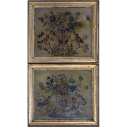 Arte del secolo XIX "Vasi fioriti uccelli sui rami e farfalle" coppia di verre peint (cm 60x70) In cornici (Difetti e mancanze)