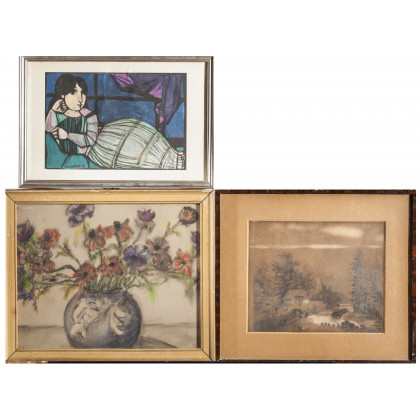 Lotto composto da due opere su carta di tecniche e misure diverse e da una riproduzione di un dipinto di Cantatore. In cornice (difetti)
