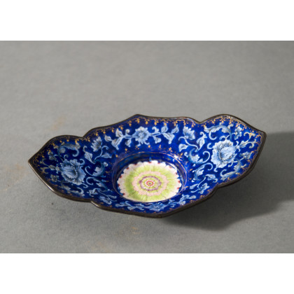 Piattino polilobato in rame smaltato Cina, Dinastia Qing (1644-1911), sec. XIX a fondo blu, decorato con motivo di peonie e foglie (restauri) A Chinese cloisonné "peony" petal shaped plate. China, Qing Dynasty, 19th century (restorations) (cm 3,5x15,5x10,1)
