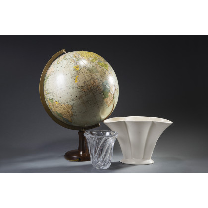 Lotto composto da un vaso in vetro marcato San Lambert, uno in ceramica bianca ed un mappamondo (gravi difetti) Lot comprising a glass vase marked San Lambert, a white ceramic vase and a globe (major defects)