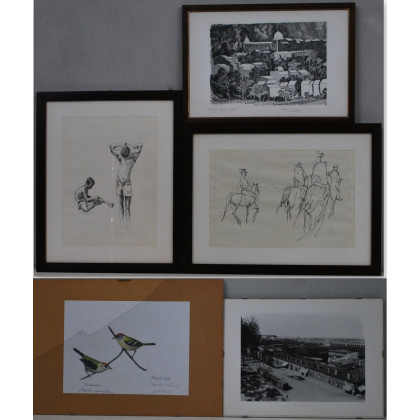 Lotto composto da due acqueforti, una riproduzione fotografica e due disegni di soggetti e misure diverse, in cornice (difetti)