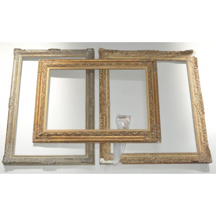 Lotto di tre cornici in legno e pastiglia dorate e laccate (cm 56,5x87; cm 71x84,5; cm 53x81,5) (difetti)