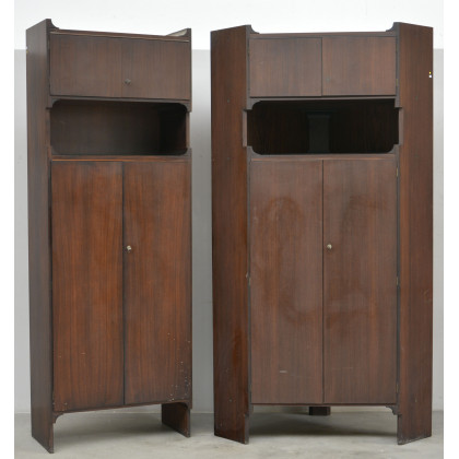 Achille e Pier Giacomo Castiglioni - Lotto composto da un mobile ad angolo e un mobile contenitore modello "Mariano", Produzione Gavina, 1961. Legno multistrato impiallacciato in palissandro indiano, due stipi ad ante, ripiano superiore in cristallo e guarnizioni in ottone trafilato. (cm 120x310x70 e cm 75x210x42) (difetti e mancanze) Bibliografia: G. Gramigna, Repertorio del design italiano 1950-2000 per l'arredamento domestico, Allemandi, Torino, 2003, p. 88; S. Polano, Achille Castiglioni 1918-2002, Electa, Milano 2001, p. 144.