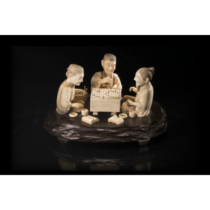 An ivory group of three Go players seated at a table, on an oval wood base with a signature in a red cartouche (losses) Japan, Meiji period (1868-1912) (l. 27 cm.)
