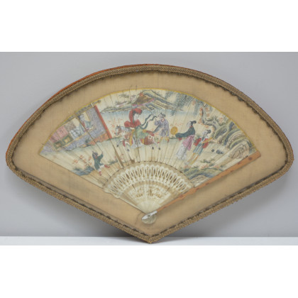 Ventaglio con stecche in avorio decorato a dorature e pagina decorata con scena di vita giapponese dipinta. Sec. XVIII-XIX, in teca (difetti)