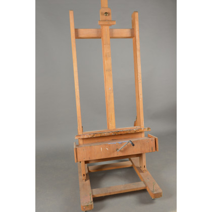 Cavalletto da pittore in legno con regolatore a manovella e vani laterali. Piedini muniti di rotelle . Inizio sec. XX (difetti)