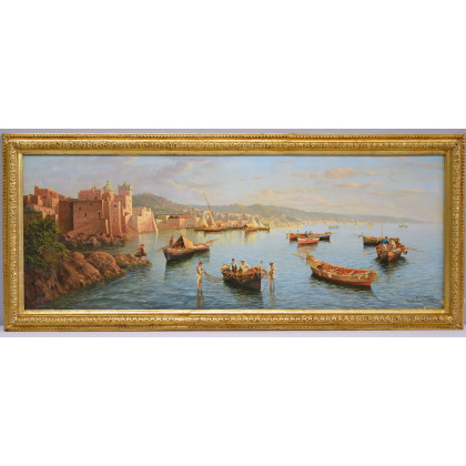 "Ischia. Veduta del borgo", olio su compensato (cm 32x85) Firmato e titolato in basso a destra. In cornice (lievi difetti)