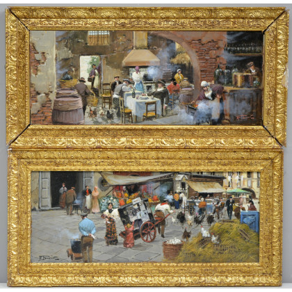 Firma indecifrata. Coppia di olii su compensato raffiguranti scene popolari (cm 20x50) In cornici (difetti)