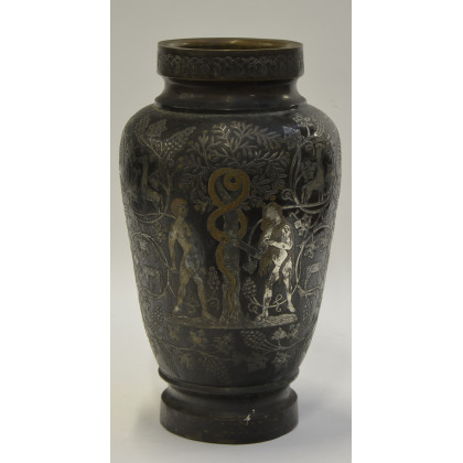 Antico vaso in rame con decori a sbalzo argentati raffiguranti "la Tentazione di Eva nel giardino dell'Eden" (h cm 44) (difetti)