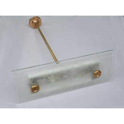 Lampadario in ottone con schermo paralume in vetro molato e inciso mediante sabbiatura. Italia, anni 30 (cm 71x90x30)(difetti e restauri)