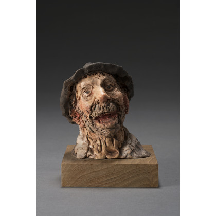 "Testa di anziano" scultura in terracotta policroma (h cm 10) Firmata al retro, poggiante su base in legno
