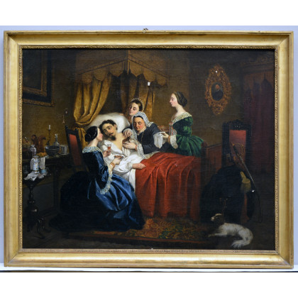 Scuola del secolo XIX "Scena di interno con personaggi" olio su tela (cm 63x79). In cornice