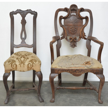Lotto composto da una poltrona ed una sedia in noce con gambe anteriori a sagoma e schienali a giorno (difetti)