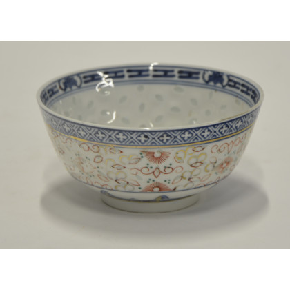 Piccola ciotola per riso in porcellana, con decoro bianco, blu e policromi con dettagli dorati. Cina, sec. XX