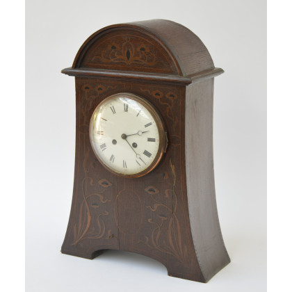 Orologio da tavolo Art Nouveau con cassa in legno di rovere intarsiato in rame a motivi floreali quadrante in smalti a numeri romani Movimento marcato F. Martin, Paris (difetti e mancanze)