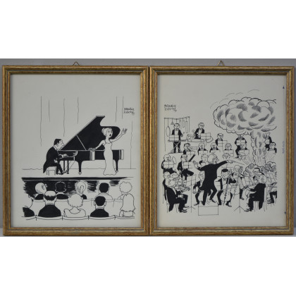 Coppia di disegni a pennarello su carta raffiguranti scene comiche (cm 28,5x24) firmate. In cornici