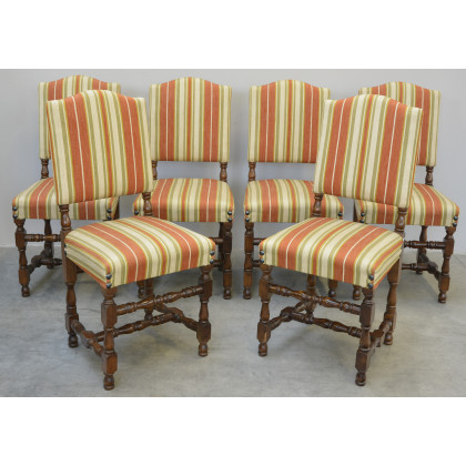 Lotto di sei sedie con gambe a rocchetto riunite da traverse con seduta e spalliera ricoperte da tessuto a strisce (difetti)