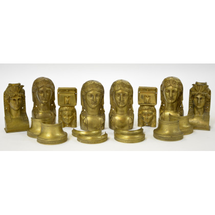Scatola contenente fregi per mobilio composta da otto teste in bronzo e alcuni capitelli (difetti)