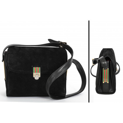 Gucci: borsa in suede color nero con tracolla, interno in pelle color rosso, dettagli in smalto rosso e verde, e metallo dorato (Brev. n. 36282), largh. cm 22 (difetti) A black suede shoulder bag, with red and green stripe clasp (width 22 cm) (defects)