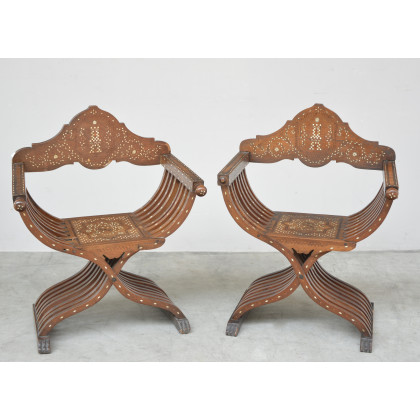 Coppia di Savonarola intarsiate a motivi moreschi con volute fogliate e stemma al centro Sec. XIX (difetti e mancanze)