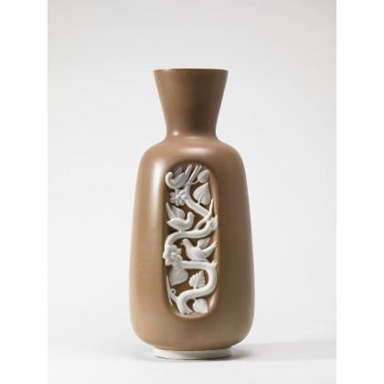 Grande vaso modello "6598", decoro "747T", in terraglia modellata a colaggio, smaltata in terra di siena e in bianco, con cartiglio a bassorilievo raffigurante uccellini e racemi vegetali. Manifattura Richard-Ginori San Cristoforo, Milano, anni 30. Marcato sotto la base "Richard Ginori - Made in Italy", con monogramma in verde, numerali "11-50-2" in verde, numerale graffito 6598 (h cm 74) Bibliografia: Società Ceramica Richard-Ginori Milano. Ceramiche d'arte della Manifattura di S. Cristoforo, catalogo n° 104, gennaio 1938, tav. 48; V. Terraroli, Ceramica italiana d’autore 1900-1950, Skira, Milano 2007, p. 193.