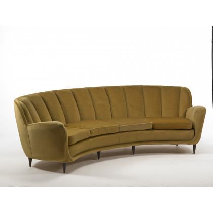 Grande divano imbottito di forma concava, a quattro posti con struttura in legno e rivestimento in velluto color senape. Italia anni 50. (cm 290x90x130)